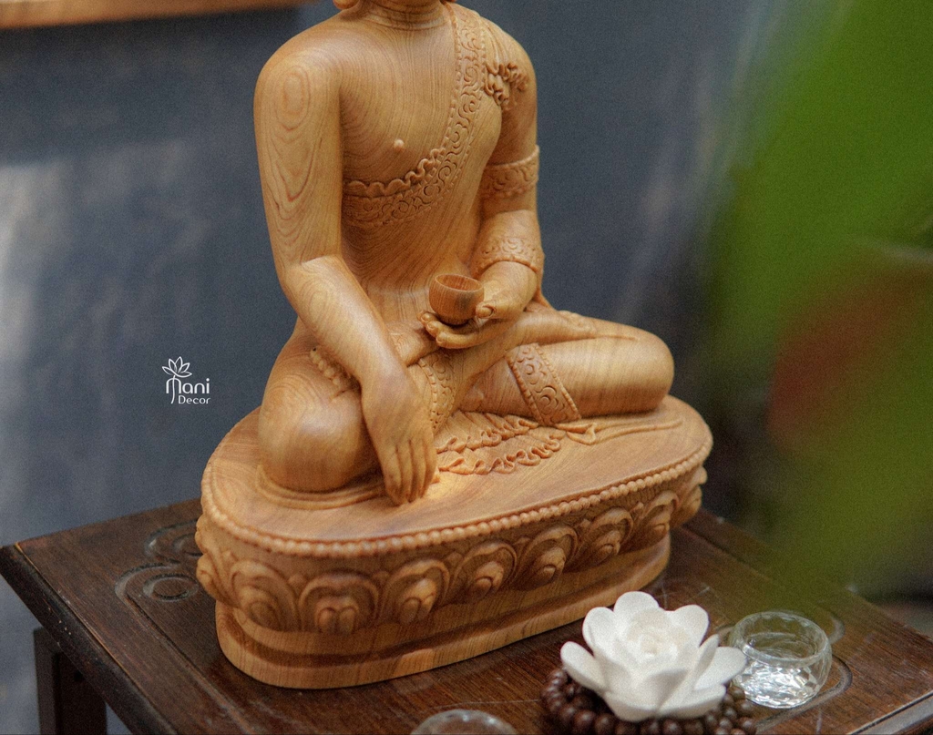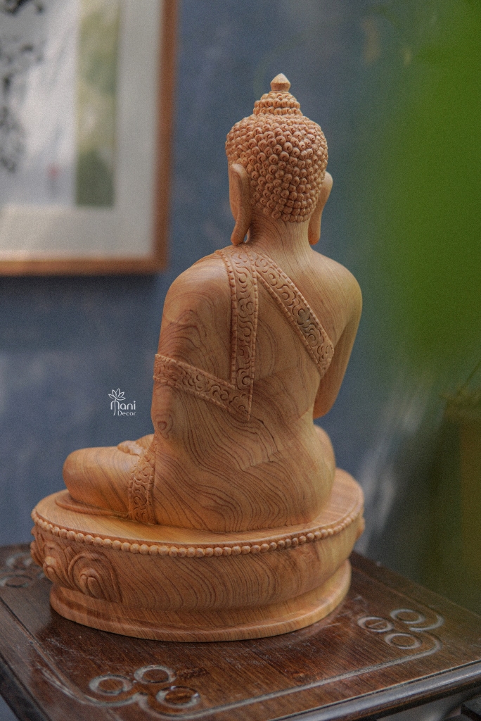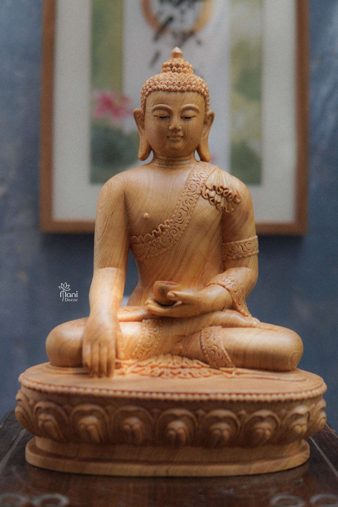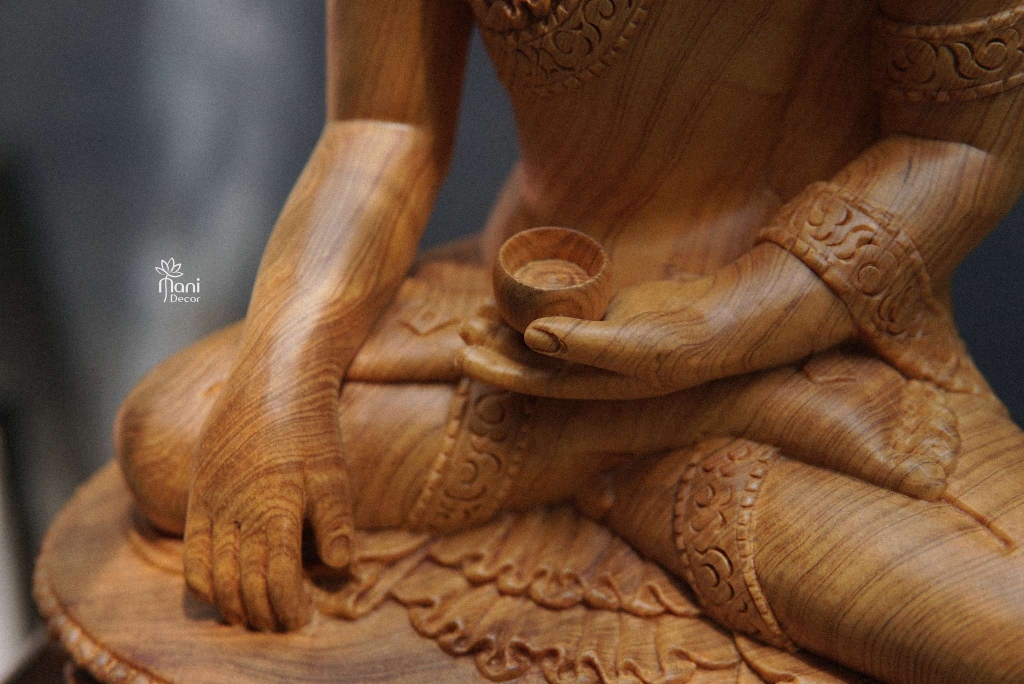 Đức Phật một tay ấn xúc địa, một tay cầm bình bát, dáng ngồi thiền định ung dung. Với gương mặt đặc trưng với đôi mắt, phần nhục kế đỉnh đầu, hoa văn trên y áo, đế sen đều được làm theo truyền thống Kim Cương Thừa.