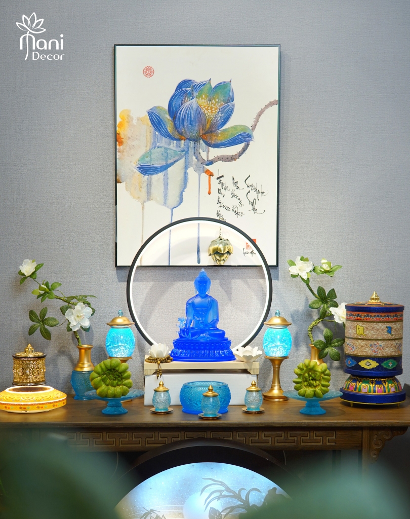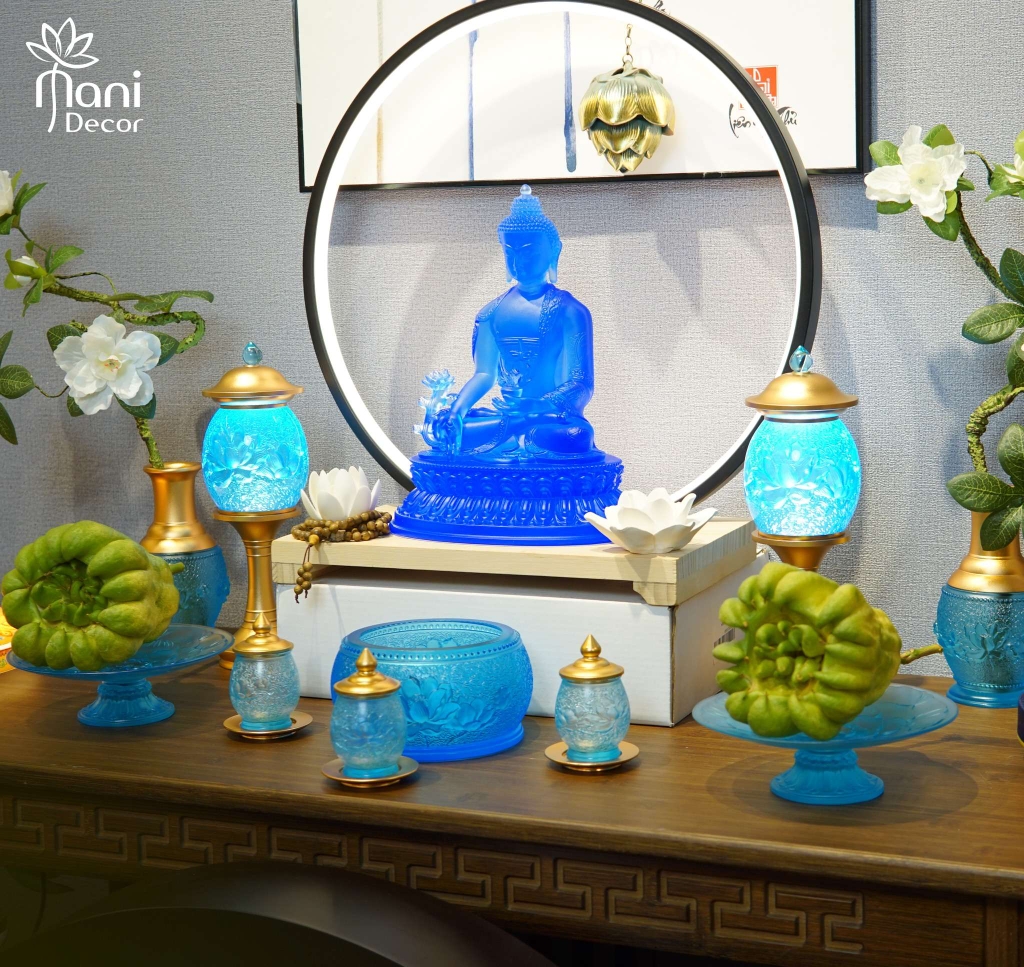 Đức Dược Sư với diện mạo thanh thoát, từ bi là tâm điểm của ban thờ. Đặt xung quanh lần lượt sẽ là những vật phẩm bình hoa, đèn, lư, cũng như ly đựng nước được làm hoàn toàn từ lưu ly, tạo nên một không gian linh thiêng như giới tịnh độ của Ngài.