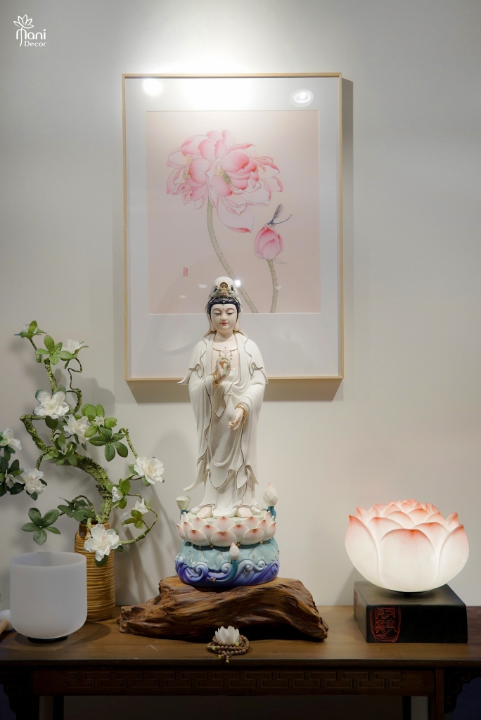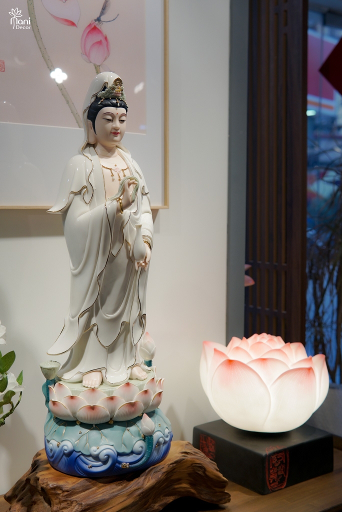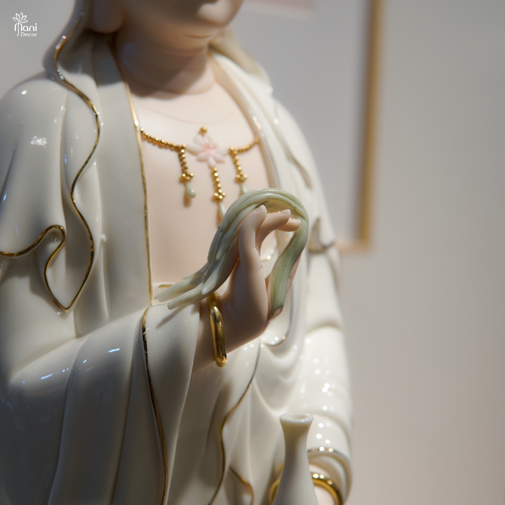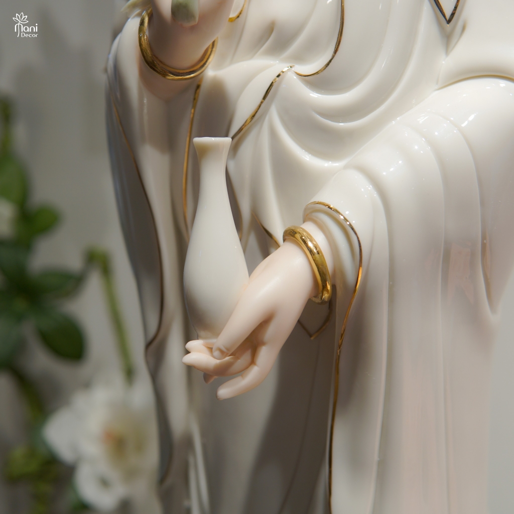 Tôn tượng Quan Thế Âm đứng trên đài sen, tay trái cầm cành liễu, tay phải cầm bình nước Cam Lồ. Với 2 pháp bảo đó, Ngài cứu giúp, phổ độ cho chúng sinh thoát khỏi những khổ ải của cuộc đời.