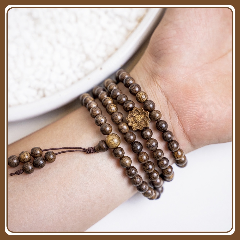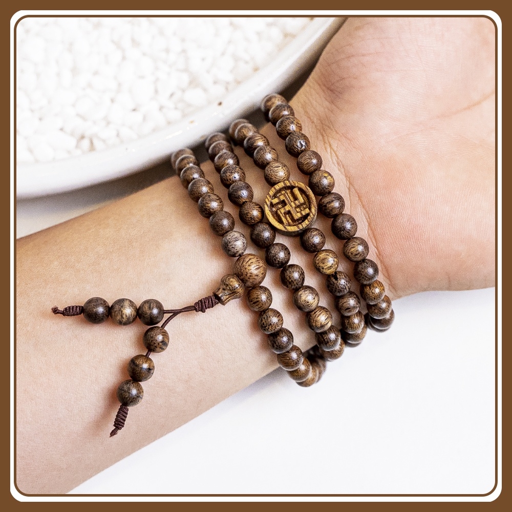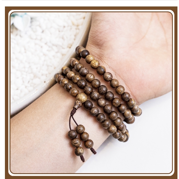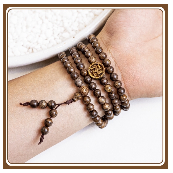 - Vòng đeo tay trầm hương được chế tác từ gỗ trầm Tốc (năm tích trầm từ 7 đến 10 năm), gồm 108 hạt, không tính đuôi công tua rua.