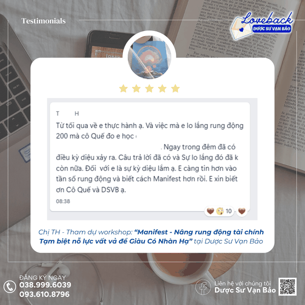 Chị TH: “Ngay trong đêm đã có điều kỳ diệu xảy ra. Câu trả lời đã có và Sự lo lắng đó đã không còn nữa. Đối với em là sự kỳ diệu lắm ạ. Em càng tin hơn vào tần số rung động và biết cách Manifest hơn rồi. Em xin biết ơn Cô Quế và Dược Sư Vạn Bảo ạ..”